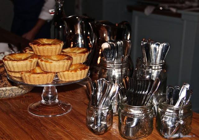 Surrounding the tables is a quirky collection of books, wines, garden tools {yes, like very nice snippers},