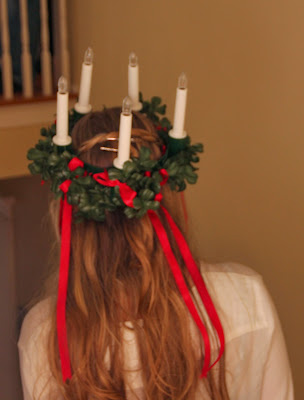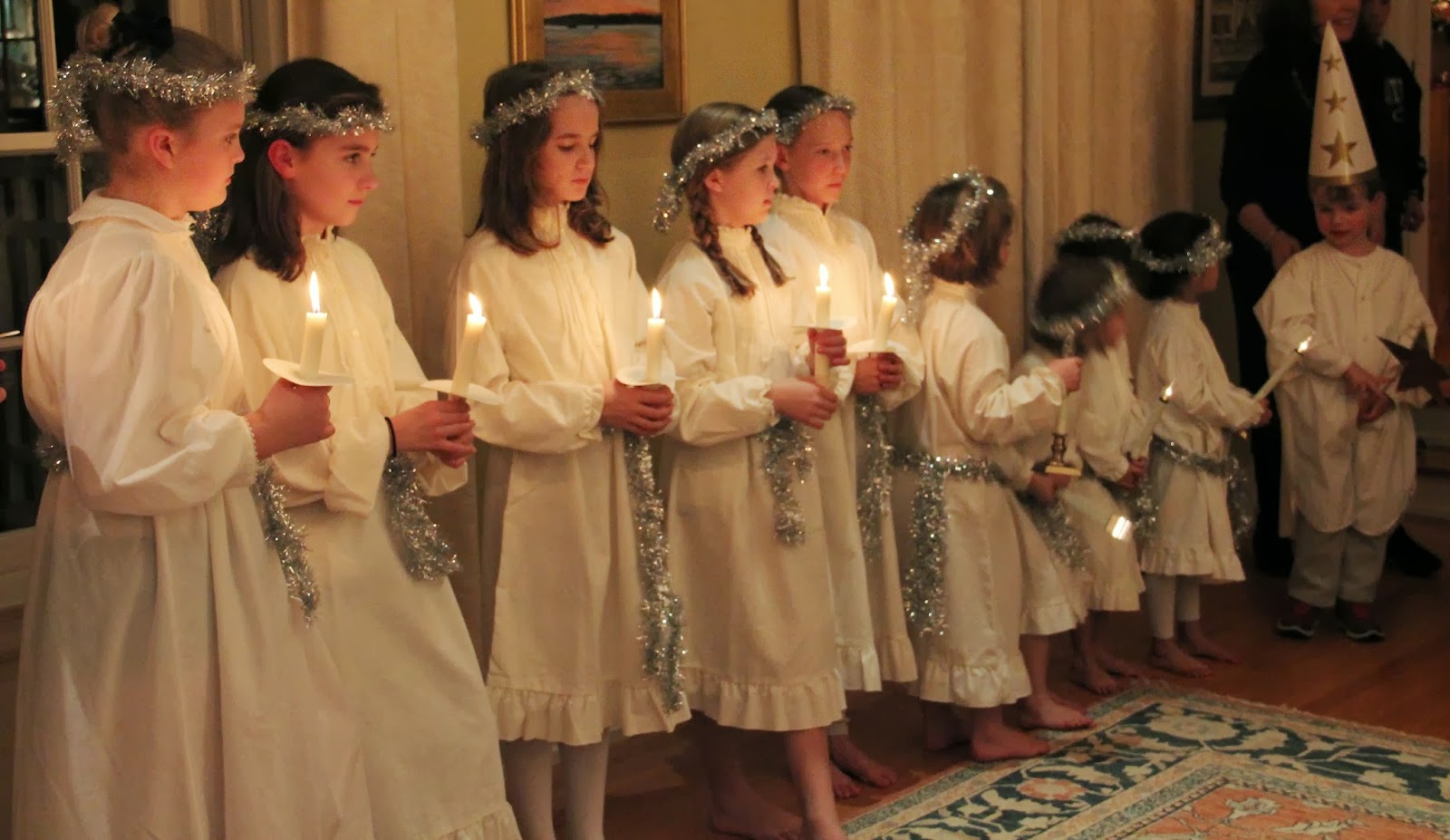 They run out to view the tree lighting in their white gowns, but after the tree is lit, a trumpet sounds to let them know it is time to go back to the house to light their candles and line up for the procession.
