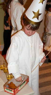 Between the tree lighting and the party, we go to a neighbors house to watch the Santa Lucia processional she organizes each year. Before the tree lighting, the children of the neighborhood enjoy traditional Swedish cookies and sparkling pear juice