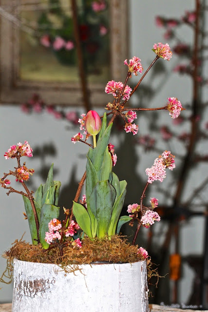 Adding cut stems to this bulb arrangement adds height, complexity, fragrance and longevity to the display, Hopefully the tulips will begin to bloom around the time the Daphne Viburnum x. bodnantense fades.