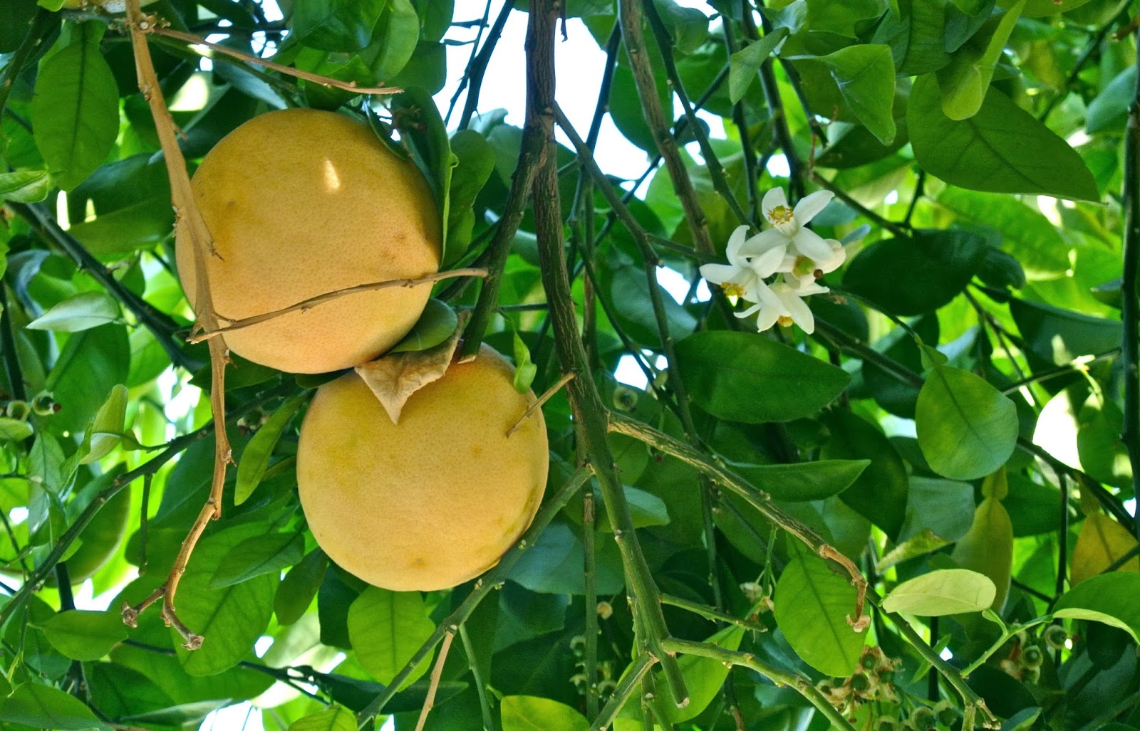 The air is thick with the ethereal scent of the grapefruit blossoms from the rows of fruited trees throughout the property.
