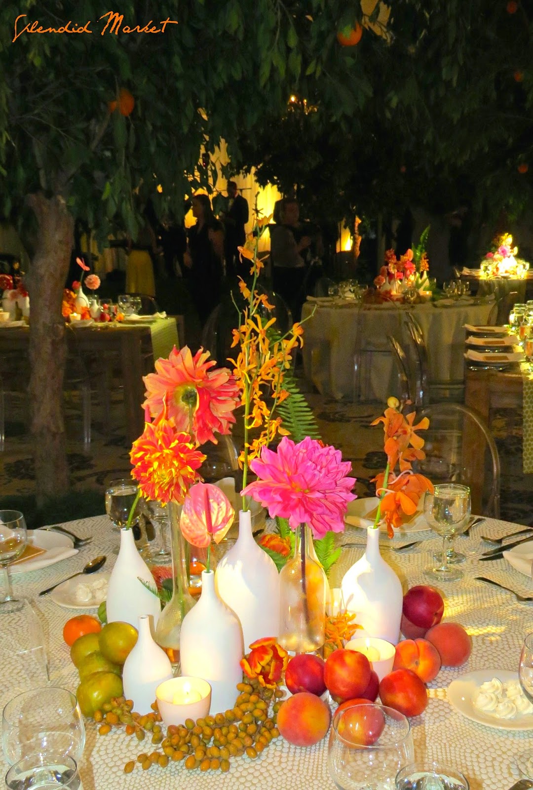To enhance the citrus theme, the tables were topped with dahlias, orchids and other flowers in citrus~y shades and collections of colorful fruit. I loved this rustic farm table with ghost chairs that was used for the head table.