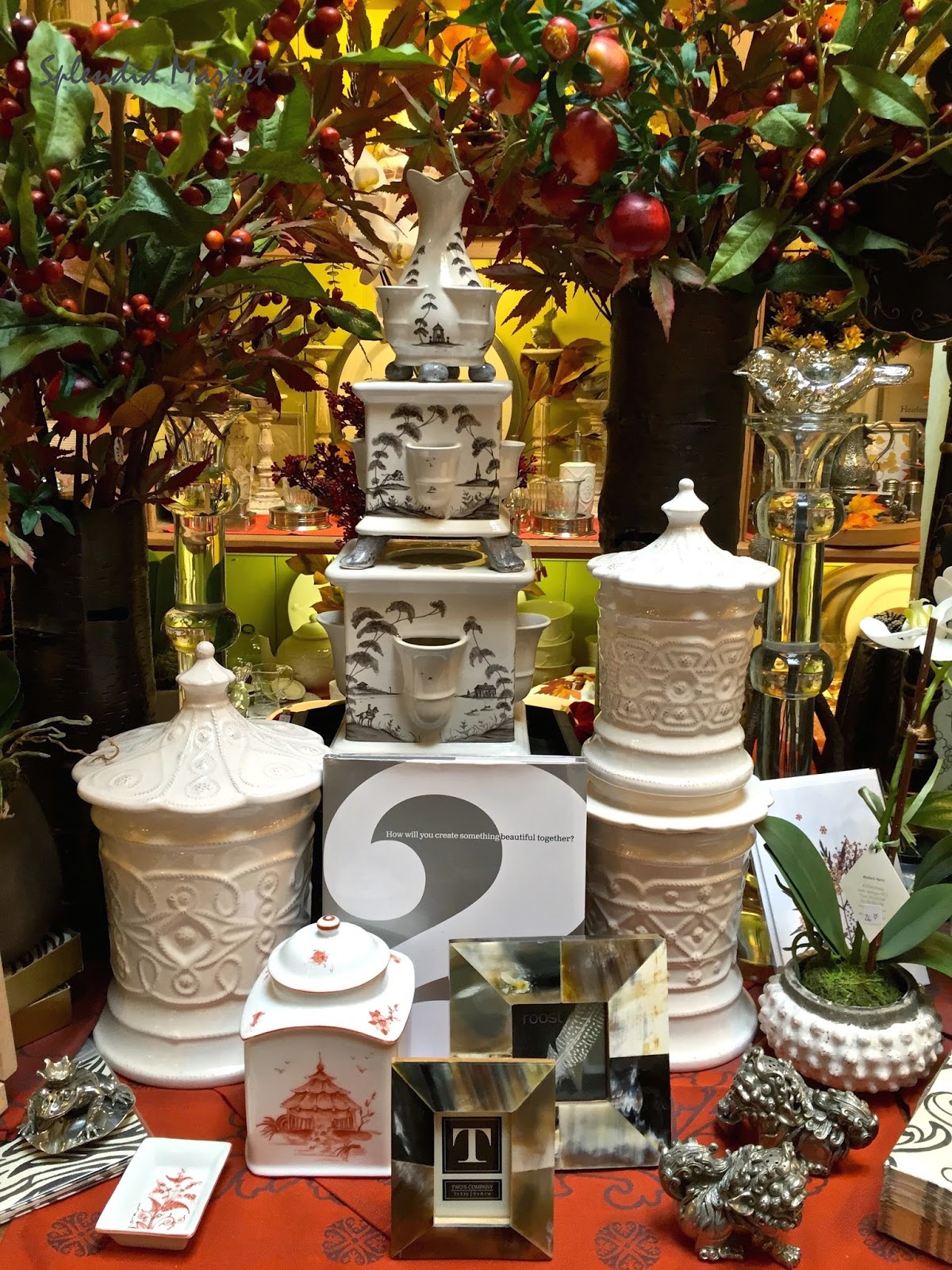 Another vignette where shades of orange and green bring warmth and a spirit of fall, this time to exotically shaped porcelain pieces, the horn frames and deep orange printed paper base enhance the sense of an exotic land.