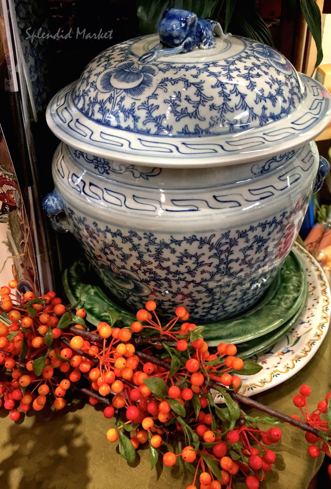 Of course, I was immediately enthralled by the combination or orange leaves surrounding beautiful blue and white ceramics.