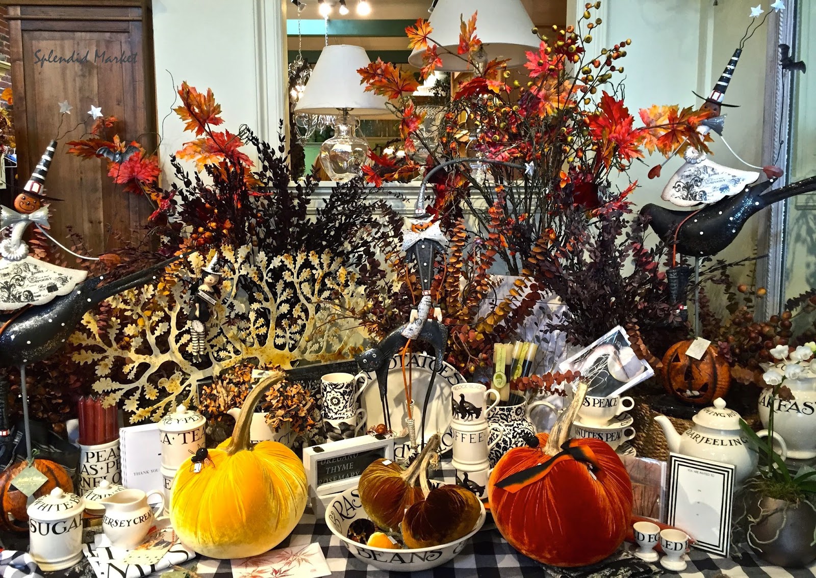 This lively display built around cream colored pottery with black lettering moves us into harvest mode with the plush velvet pumpkins and more colorful leaves and berries.
