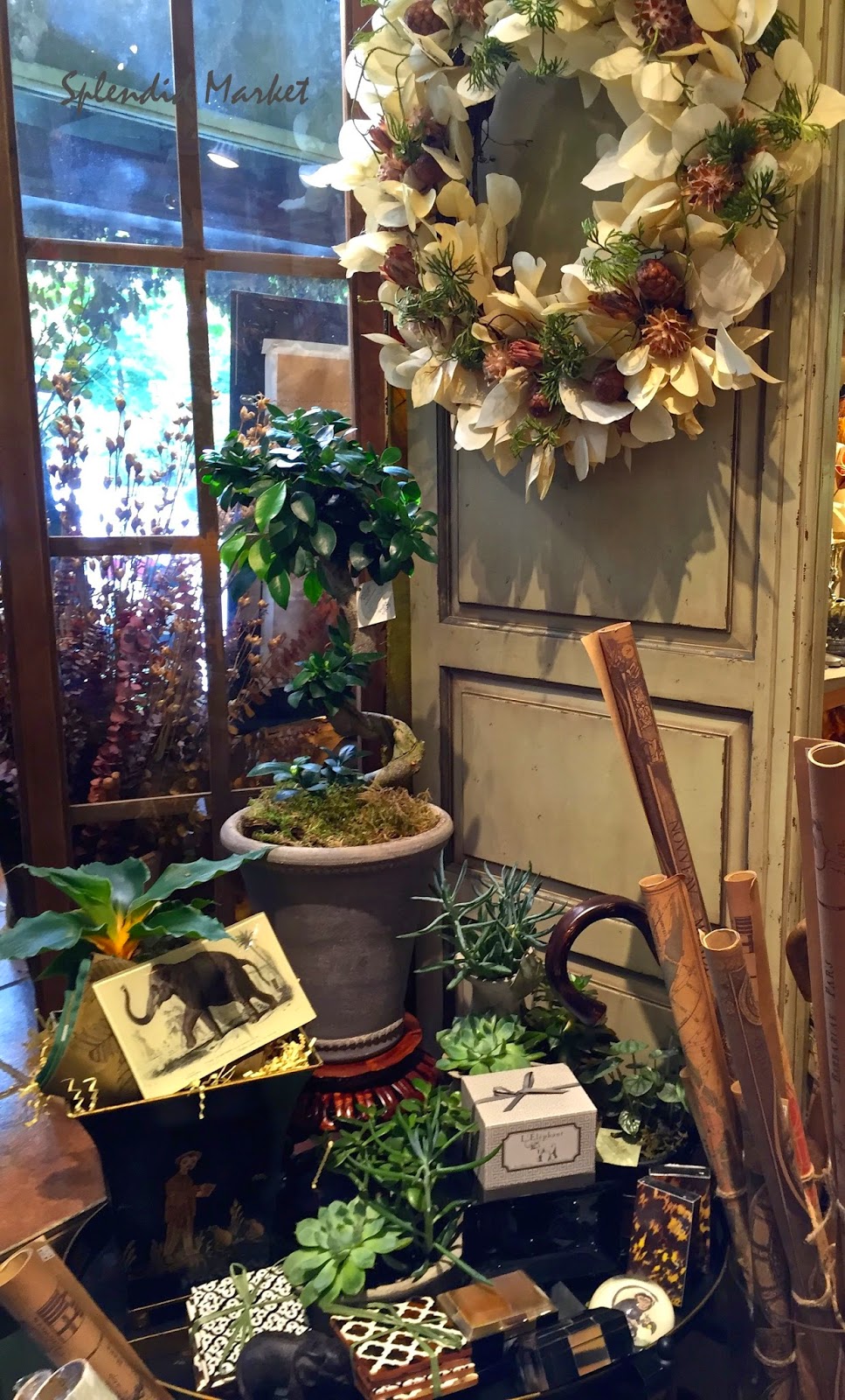 I loved this little Out of Africa vignette with Moroccan-looking coaster tiles, carved wooden walking sticks, exotic plants including a gardenia and sedums, horn desk accessories and elephant imagery.
