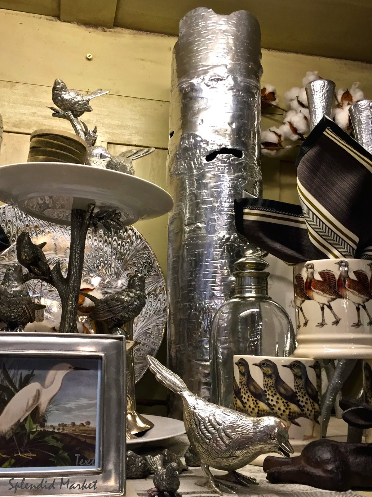 I love this pewter bark piece, the frost of the pewter is warmed with scenes of birds and stalks of cotton.