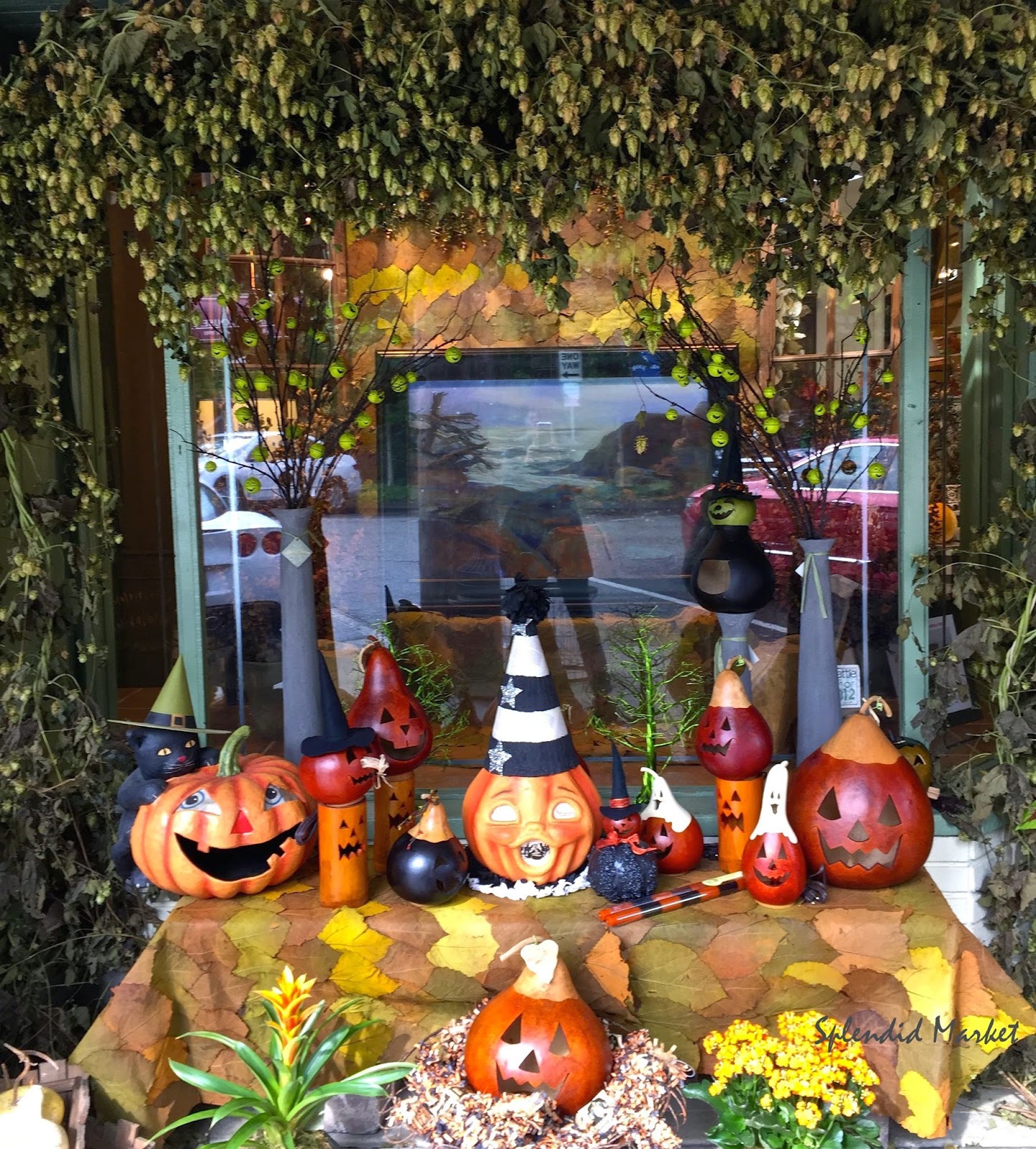 The front of the store screams Halloween with these fun jack~o~lanterns, many are hollowed out and dried gourds which you could reuse for years to come. The window is framed with rich layers of green hops.
