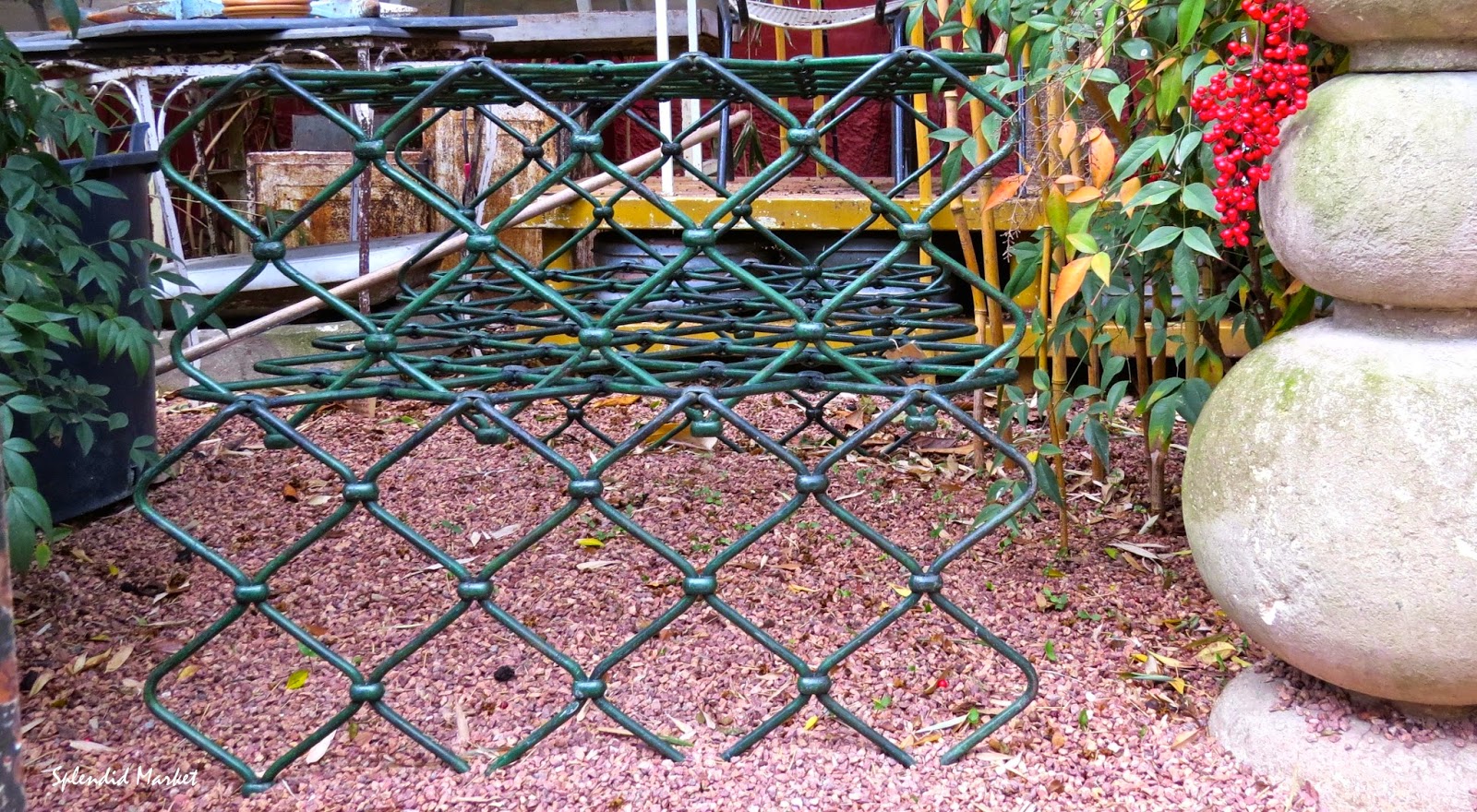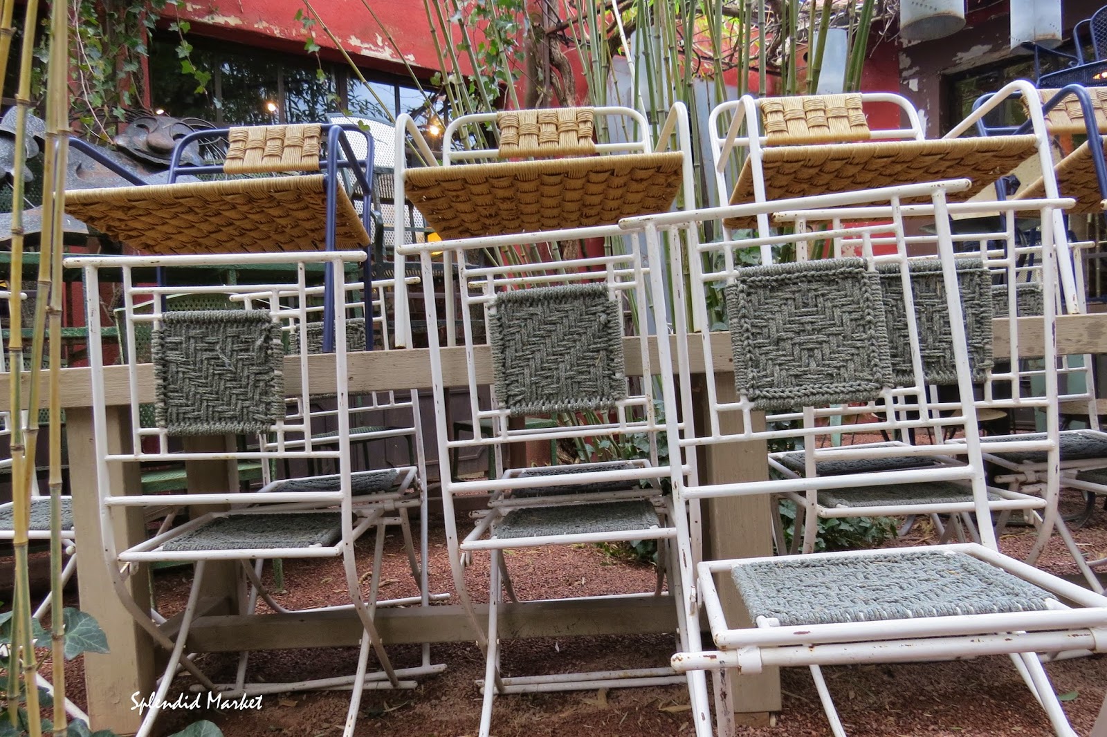 He’s created an enchanting garden area with bamboo that is filled with great outdoor furniture. I love these folding pagoda style chairs, it is an exceptional set of 10 chairs, very unique.