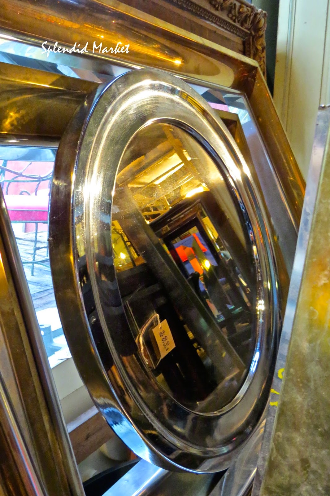 Collections of mirrors, frames and paintings can be found throughout the shop, this chrome mirror is especially handsome.