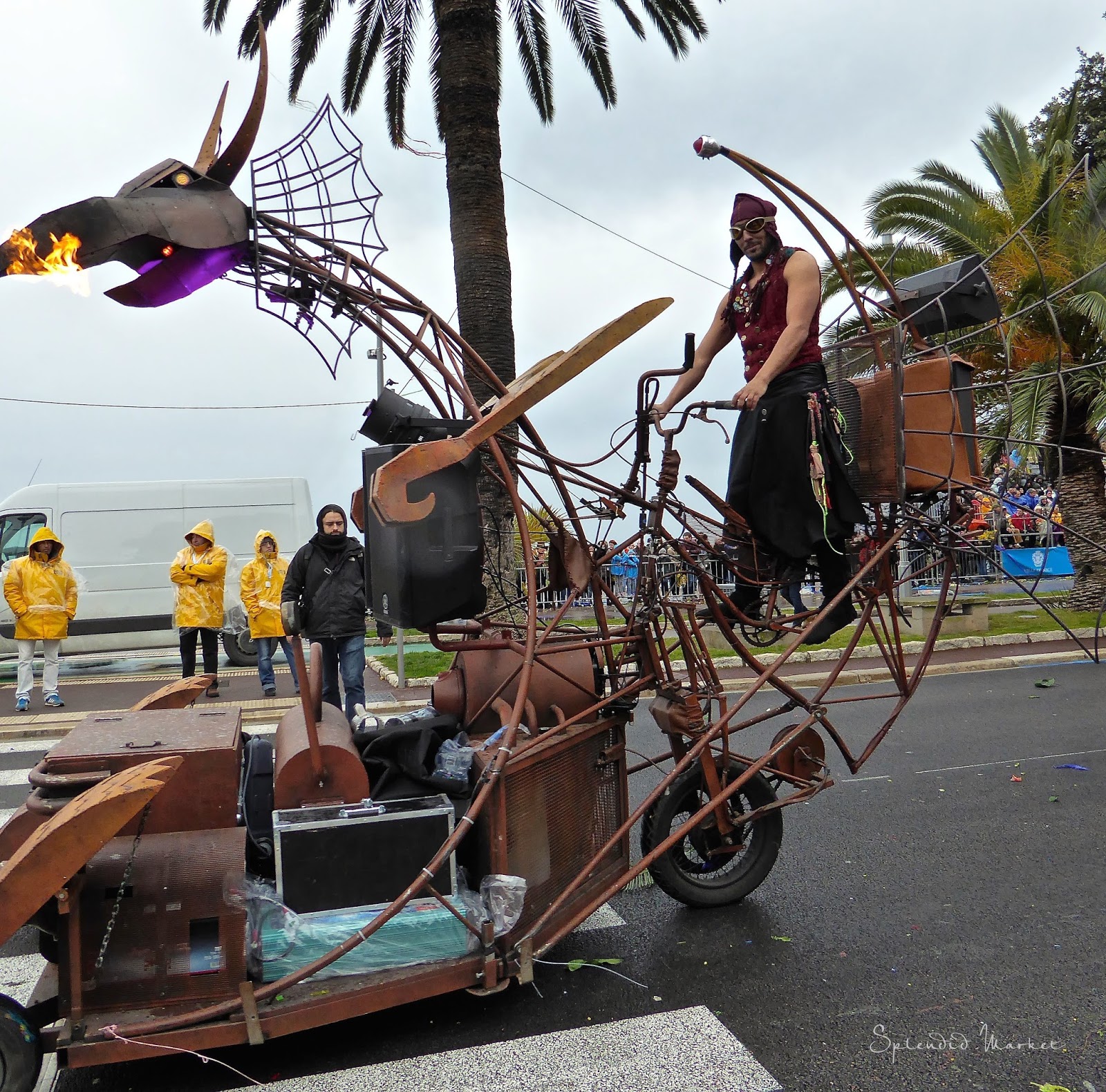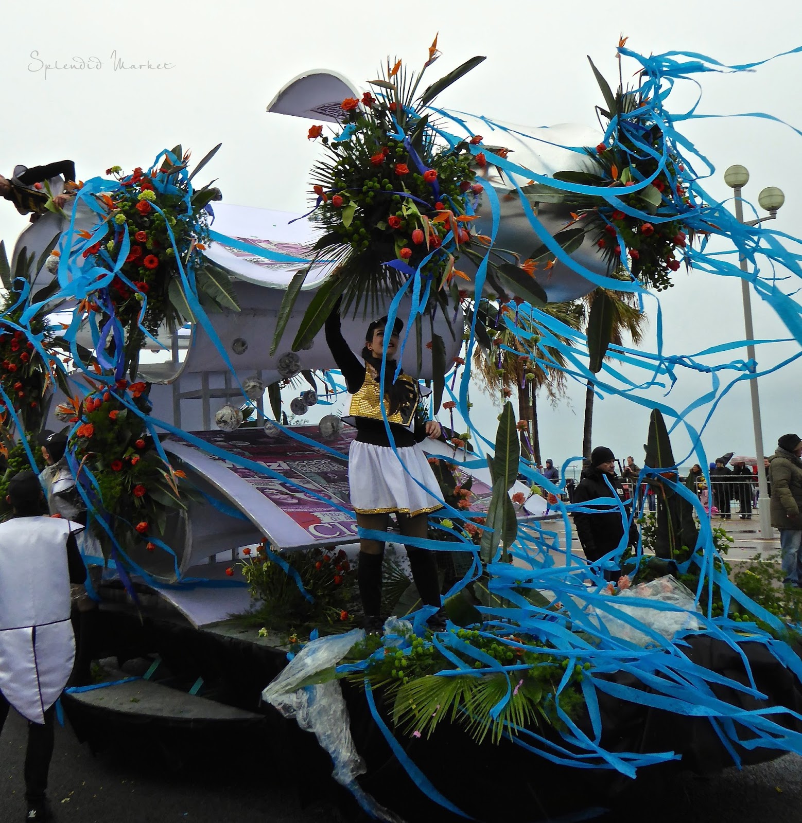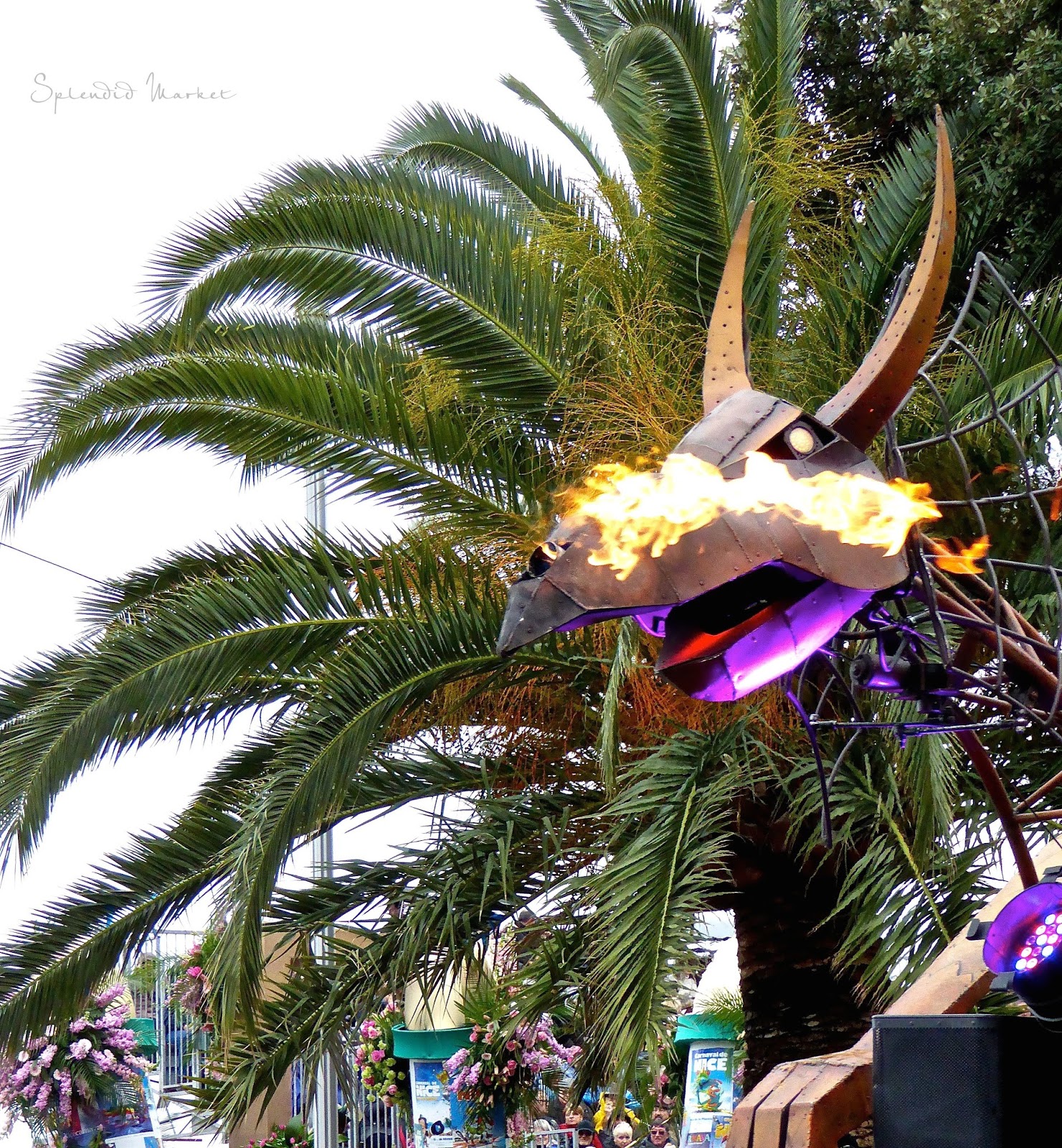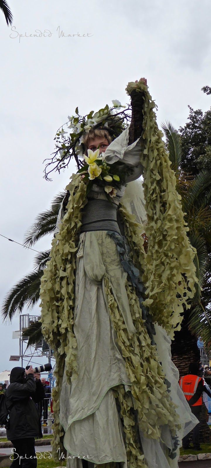 In 1872 they first started throwing things to the crowds from the elaborately decorated floats that rolled by…. typically confetti, flowers and eggs. Today loud confetti bombs shower the crowds with paper confetti and air guns shoot out streams of colorful tinsel that hang from the palm trees that run down the center of The Promenade des Anglais, much like the Mardi Gras beads hanging from the trees in New Orleans.