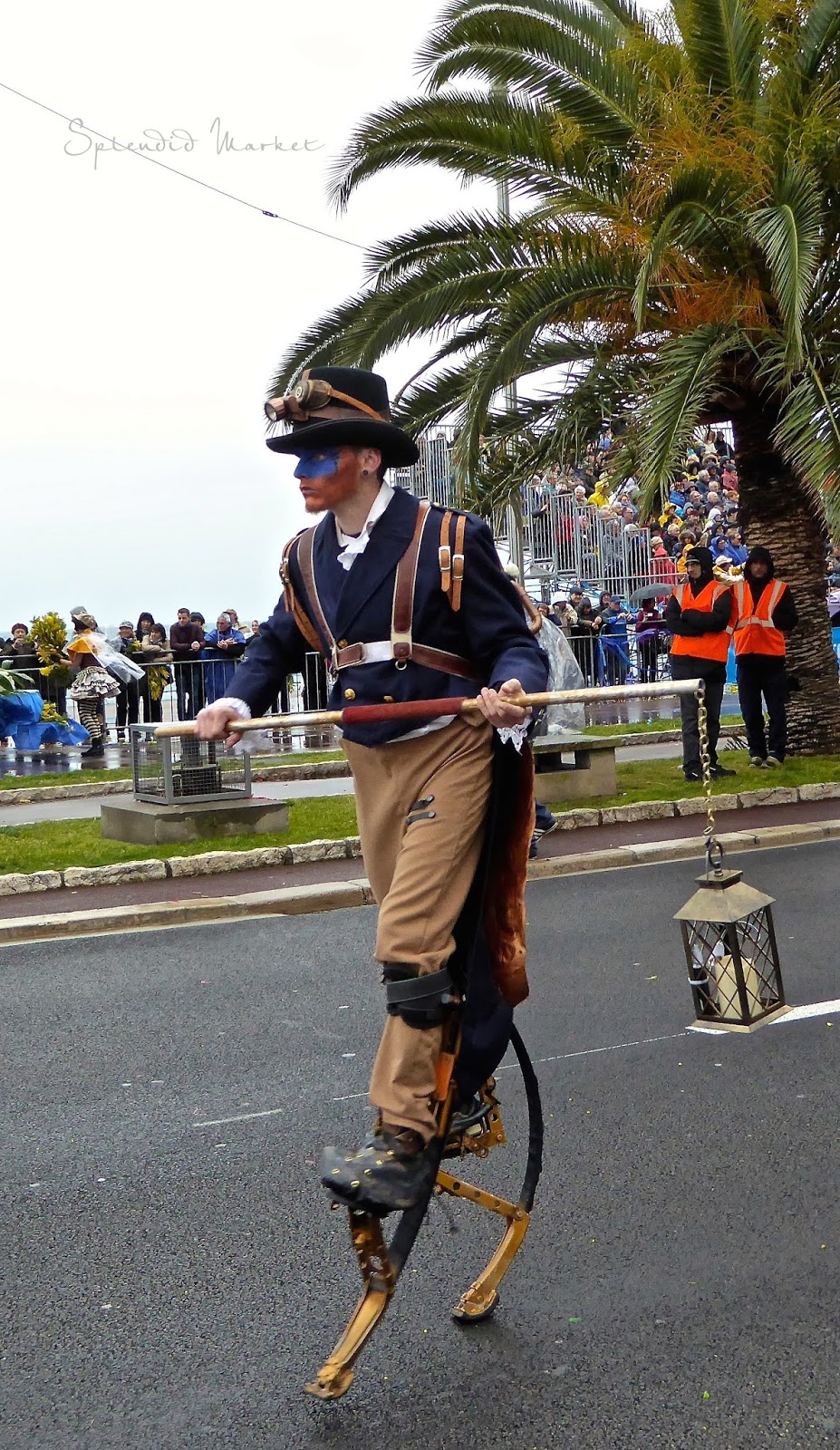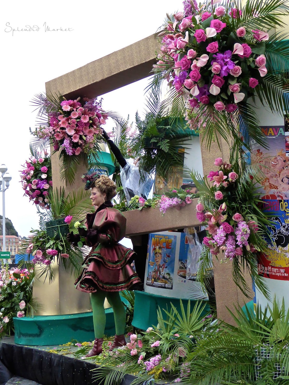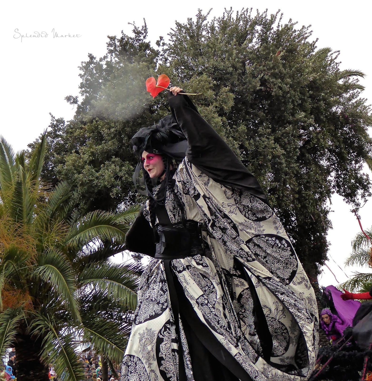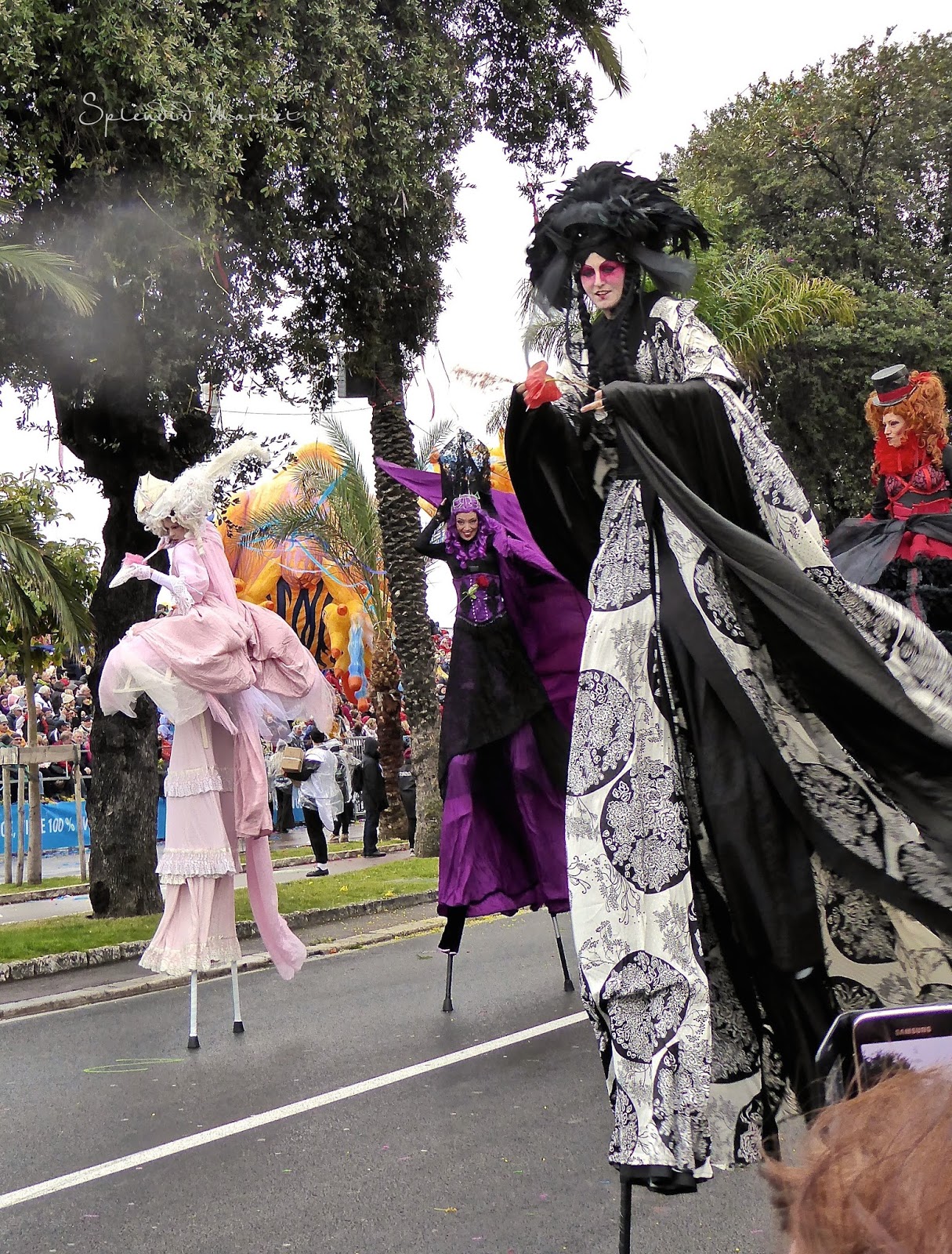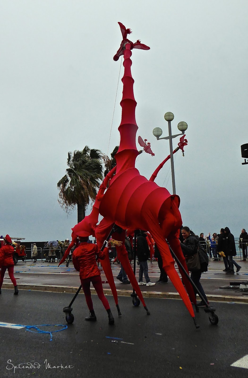 In 1872 they first started throwing things to the crowds from the elaborately decorated floats that rolled by…. typically confetti, flowers and eggs. Today loud confetti bombs shower the crowds with paper confetti and air guns shoot out streams of colorful tinsel that hang from the palm trees that run down the center of The Promenade des Anglais, much like the Mardi Gras beads hanging from the trees in New Orleans.