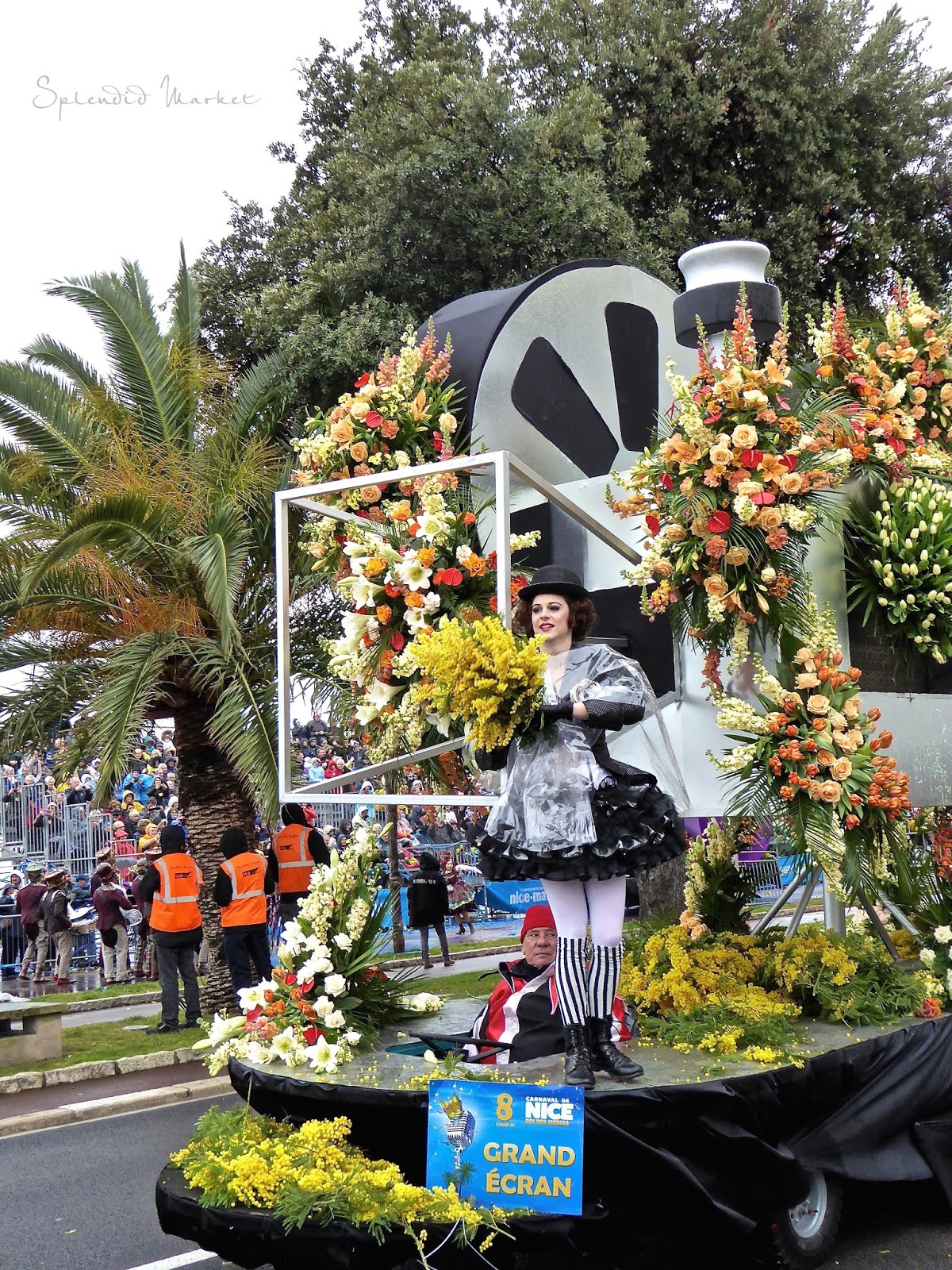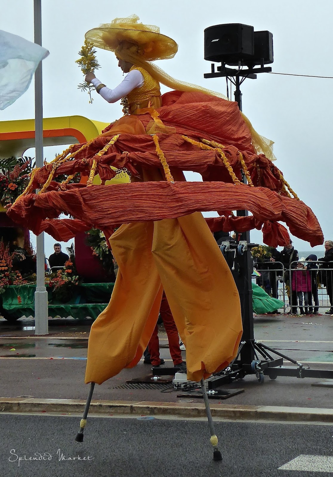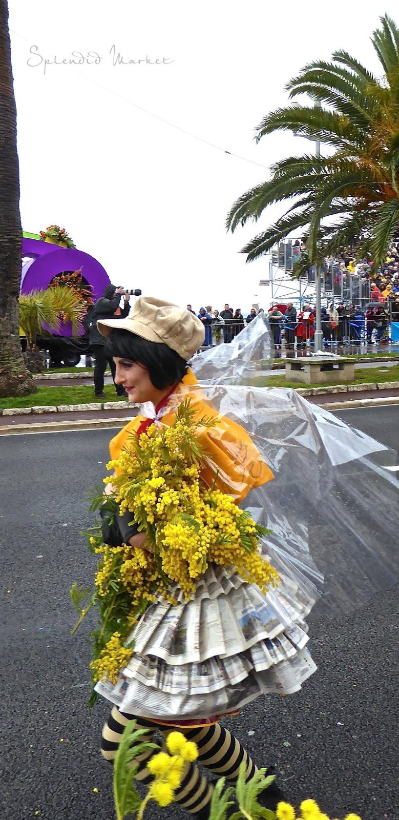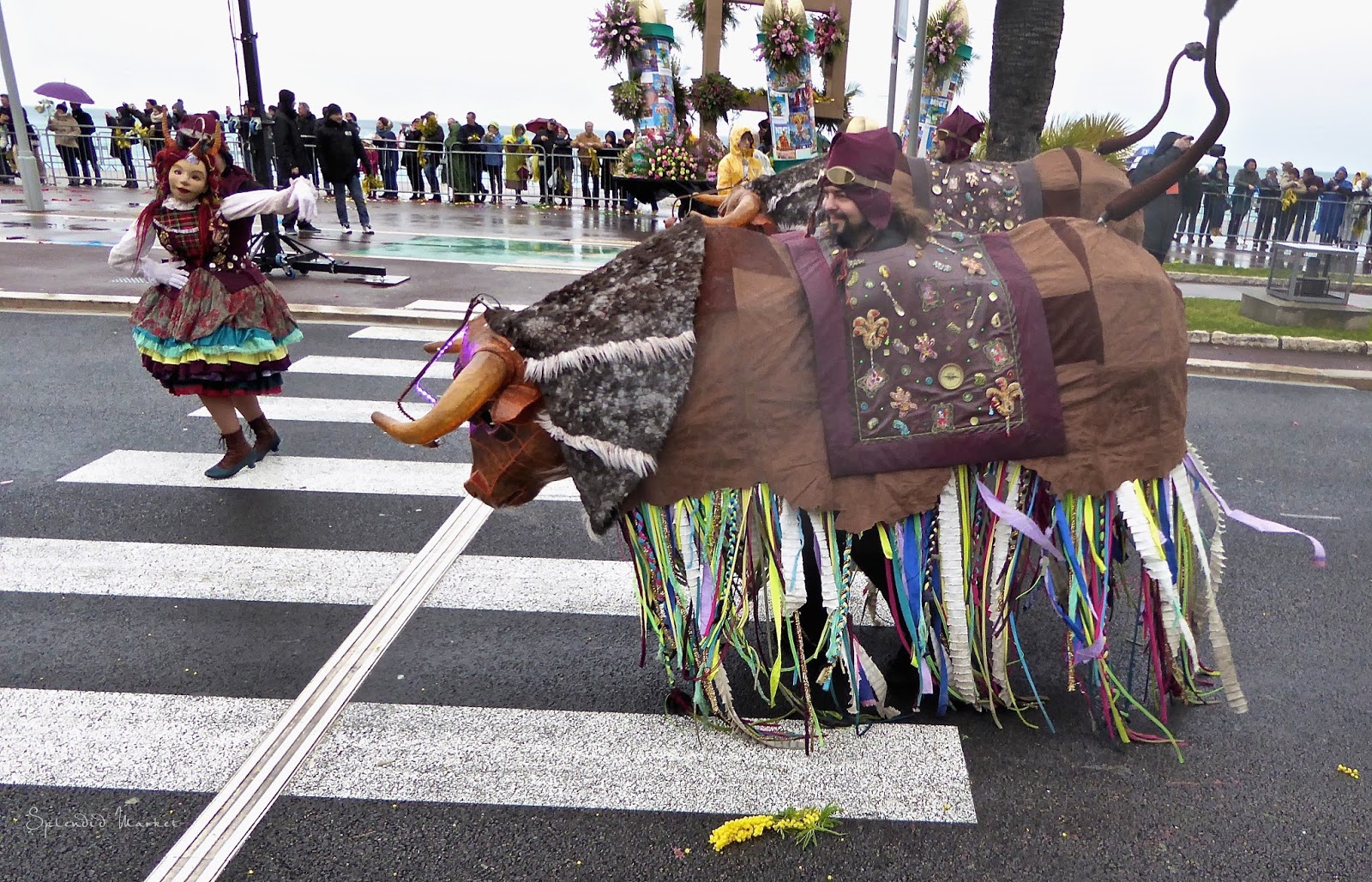 It was a cold and blustery day on the Promenade Des Anglais, which winds along the Mediterranean Sea, but the festive floats rolled on and riders in fanciful costumes threw bunches of mimosas to the crowds.