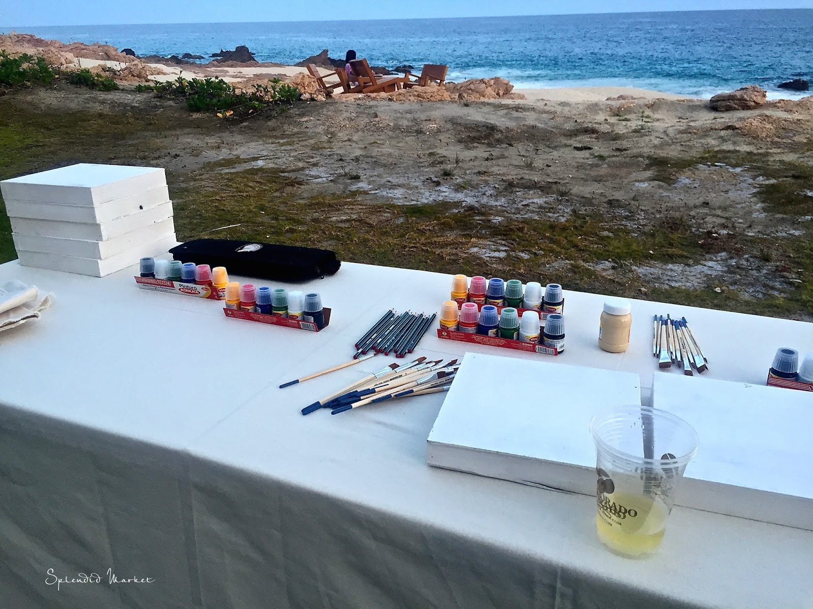 On a recent girls trip to Mexico we had a very fun form of entertainment for cocktail hour….PAINTS and brushes and canvases and colored pencils… on the beach! We were in a picturesque setting and it didn’t take long for the creative juices to start flowing. Last week I recreated the experience for a birthday celebration on Orcas. Read on to see how you and your gal pals {and/or hubbys and/or kids} can do this with ease.