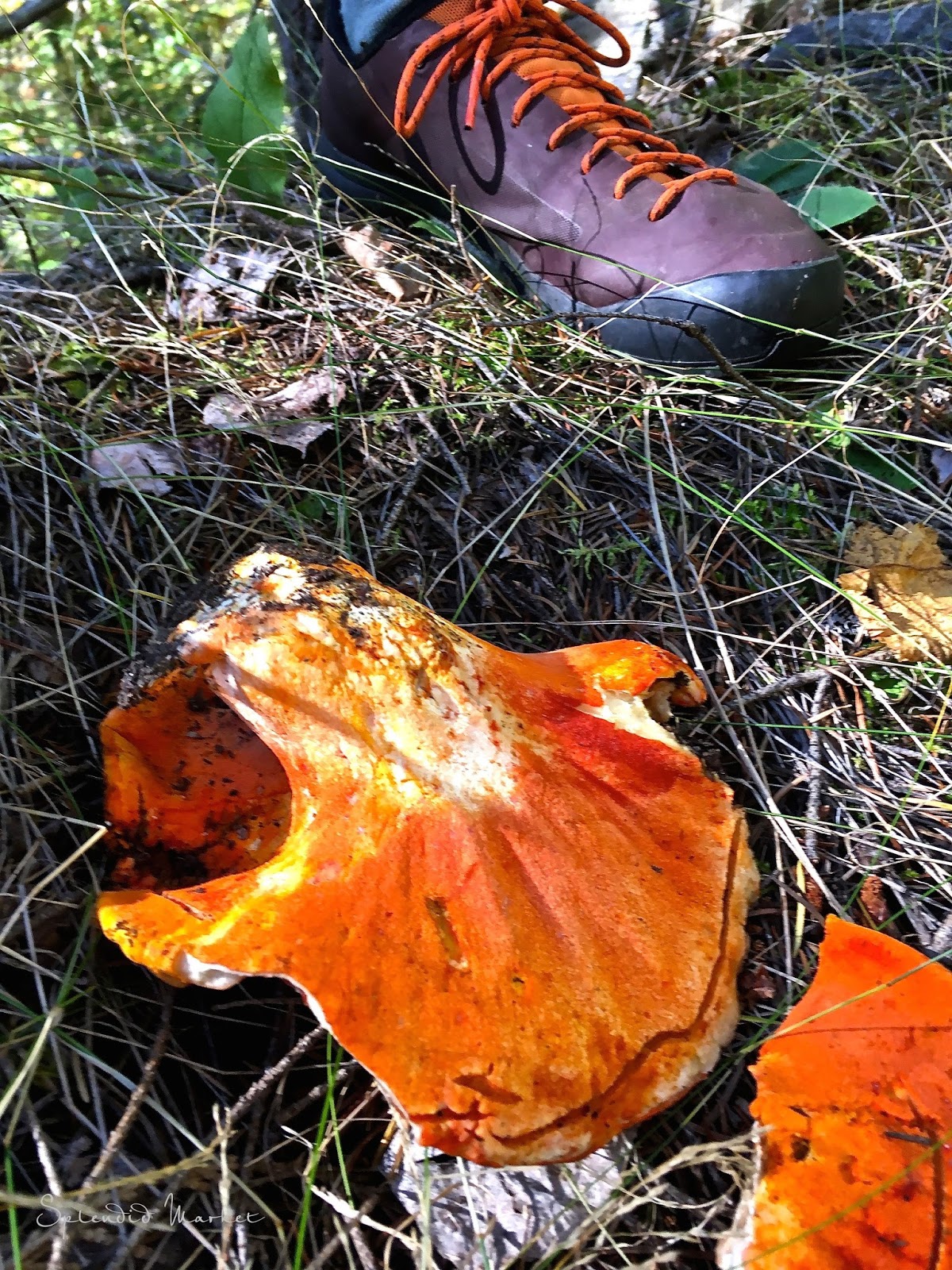 Not only do they look like a lobster {the crustacean~like color actually comes from an attacking mold}, but the texture and taste, when cooked, is similar to lobster meat. But we were on a set diet at Mountain Trek, so we left this gargantuan specimen for fortunate future foragers.
