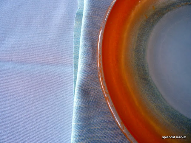 The hearty blue stoneware ashtrays (with a little (orangish) red clay showing through) were the perfect contrast to the delicate glass plates.