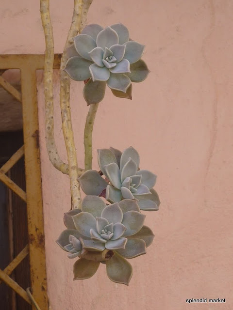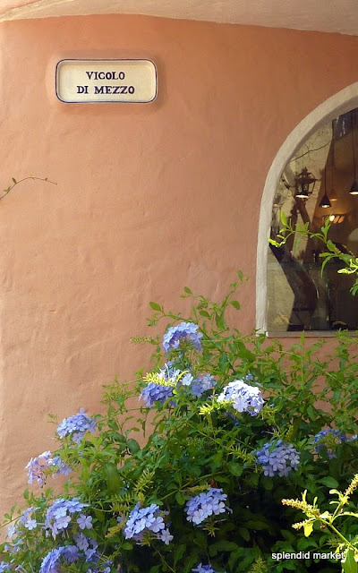 These sedums hung down from a potted plant, on the balcony high above the table where we sat for a supreme lunch on dell’isola di La Maddalena. The sage blue “blossoms”, with the pale coral background was a beautiful display, coincidentally. I’m not quite sure how to replicate this, but it’s worth considering! What a flavorful, friendly lunch we had of fresh seafood and tender pasta, out of the winds, at a long table in the alley, at the restaurant Osteria da Liò.