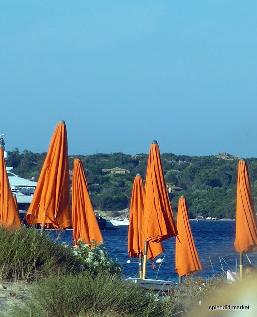 These satsuma umbrellas stood out against the cerulean blue sea and the sun drenched sky at a beach club in Cala di Volpe.