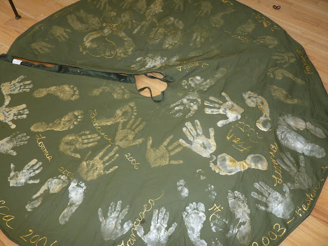Every year, before draping it over the base of the tree, the “younger set” at Splendid Market, both the 2 and 4 legged variety, is subjected to a hand and foot printing, for the annual record, on the backside of the green quilted velvet tree skirt.