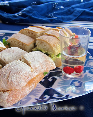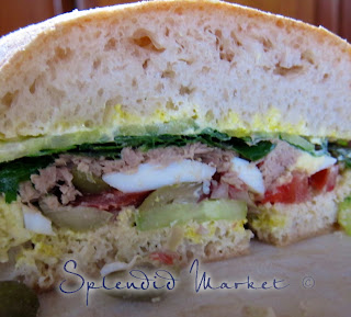 Then I peeled and thinly sliced a cucumber, then put the slices in a generous amount of Splendid Vinaigrette {recipe below} to marinate for a few minutes. I happened to have had some saffron aioli on hand, so I spread that on each of the cut sides. Then I covered the lower portion with the marinated cucumber slices, and layered on ripe tomatoes, baby arugula leaves, basil leaves, thin slices of red onion, marinated artichoke quarters, capers, green olives, slices of boiled eggs, Italian tuna {packed in olive oil}, and anchovies.