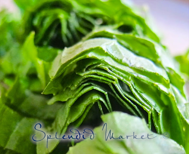 Next, roll the stack of leaves, to make a thick tube, and then slice the tube to create these flavorful little strips for your salad.