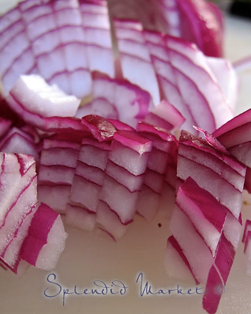 Do onions make you cry? Me too. So I’ve found a way to cut them quickly to minimize my exposure. After removing the outer papery layer, I cut the onion in half and remove the core. Next, I make slices through the curve of the slices {make the slice as thick or thin as you need for your recipe}, then I slice those sections in the other direction. You can mince these chunks if you’d like something smaller. BTW, I’ve found that cold onions release fewer of those volatile gases that make my eyes sting.