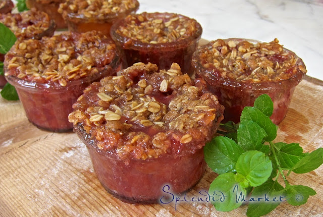 I love seeing the pretty fruit colors through the glass with the contrasting crunchy top. Everyone loved nibbling every last bit of the fruit and crunch that bubbled over the sides from their own personal dessert.
