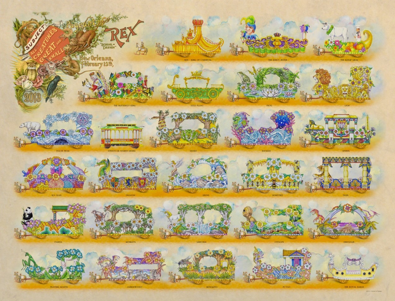 “This year’s theme is presented both in English (“Royal Gardens”) and in Latin (“Horti Regis”), emphasizing the timeless significance of gardens. The desire to be surrounded by beauty is as old as mankind itself. In every time and culture artists have arranged natural elements into gardens to please all of the senses. Emperors and Kings assured that their gardens were planned with as much care as their castles, and some of these gardens were counted among the wonders of the world. The 2016 Rex Procession takes us to splendid gardens known only from ancient illustrations and descriptions, and to others still providing beautiful sights to those who visit them. In the best tradition of Rex artistic design, watch for a parade filled with colorful flowers, historic figures, and colorful costumes.”